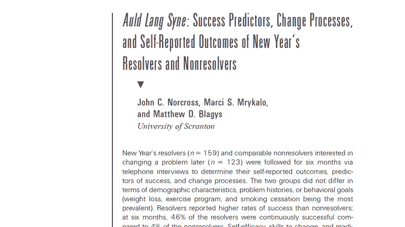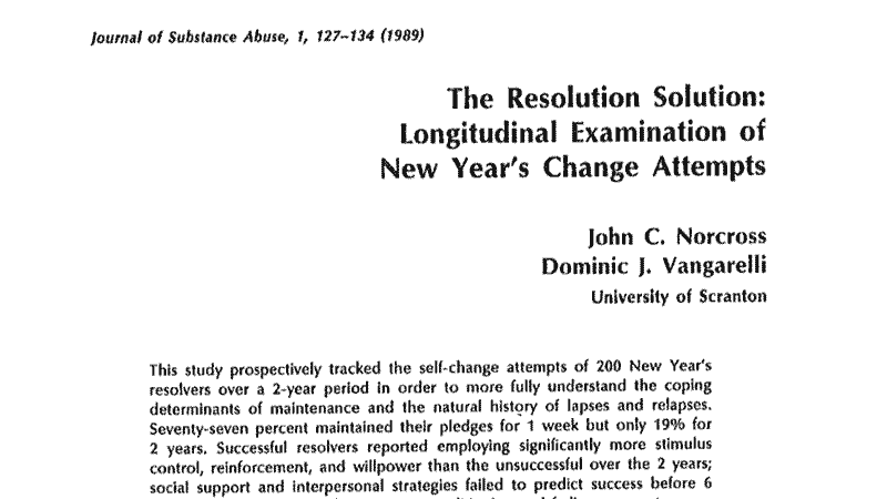 The first study by Dr.Norcross, published in 19891. The study followed 200 subjects who made New Year’s Resolutions for 6 months and reported on their rate of adherence to their resolutions.