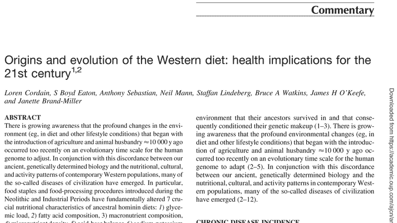 1. Cordain L, Eaton SB, Sebastian A, et al. Origins and evolution of the Western diet: health implications for the 21st century. Am J Clin Nutr. 2005;81(2):341-354.