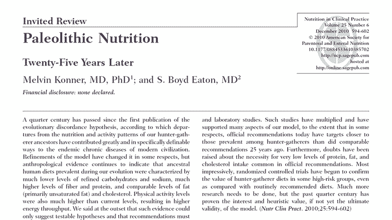 1. Konner M, Eaton SB. Paleolithic nutrition: twenty-five years later. Nutr Clin Pract. 2010;25(6):594-602.