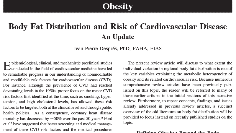 1. Després JP. Body fat distribution and risk of cardiovascular disease: an update. Circulation. Sep 4 2012;126(10):1301-13. doi:10.1161/circulationaha.111.067264