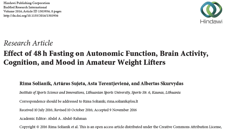 1. Solianik R, Sujeta A, Terentjevienė A, Skurvydas A. Effect of 48 h Fasting on Autonomic Function, Brain Activity, Cognition, and Mood in Amateur Weight Lifters. BioMed Research International. 2016;2016:1-8. doi:10.1155/2016/1503956