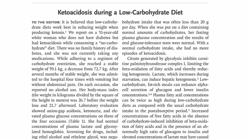 As I said there it is very unlikely that such thing would happen, but it nevertheless possible – there are some case reports where a person following a ketogenic diet enters a benign ketoacidosis. Here is one of these case reports – an article published in New England Journal of Medicine in 2006 by Drs. Shah and Isley1. Totally worth reading – a healthy woman followed a strict low-carbohydrate diet for several months and presented to the hospitals with signs and symptoms of ketoacidosis, confirmed by laboratory tests.