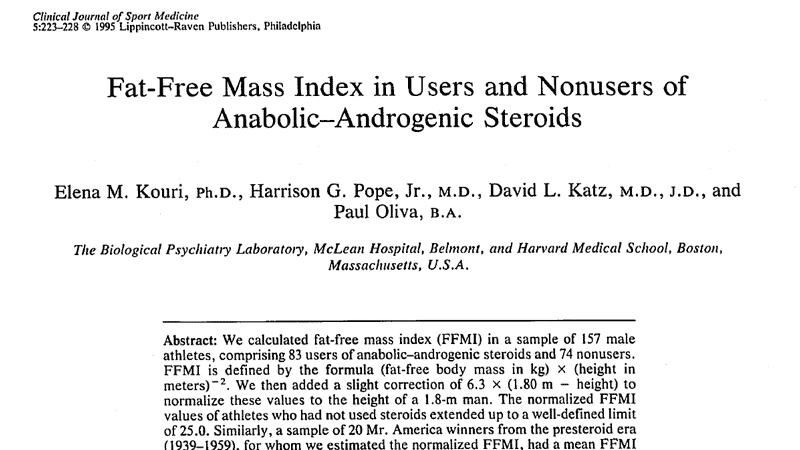 1. Kouri EM, Pope HG, Jr., Katz DL, Oliva P. Fat-free mass index in users and nonusers of anabolic-androgenic steroids. Clinical journal of sport medicine : official journal of the Canadian Academy of Sport Medicine. 1995;5(4):223-228.