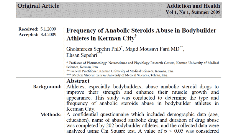 1. Sepehri G, Mousavi Fard M, Sepehri E. Frequency of Anabolic Steroids Abuse in Bodybuilder Athletes in Kerman CityThis article has been published in the Journal of Rafsanjan University of Medical Sciences in Persian language. Addiction & Health. 2009;1(1):25-29.