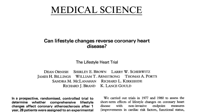 This is quite an influential study by Dr.Ornish1. They conducted a clinical trial of a comprehensive behavioral and nutritional intervention in people with severe coronary artery disease. The experimental group (n=28) received a complex intervention, which included low-fat vegetarian diet, stress management, smoking cessation and moderate exercise. The control group (n=20) received treatment as usual.